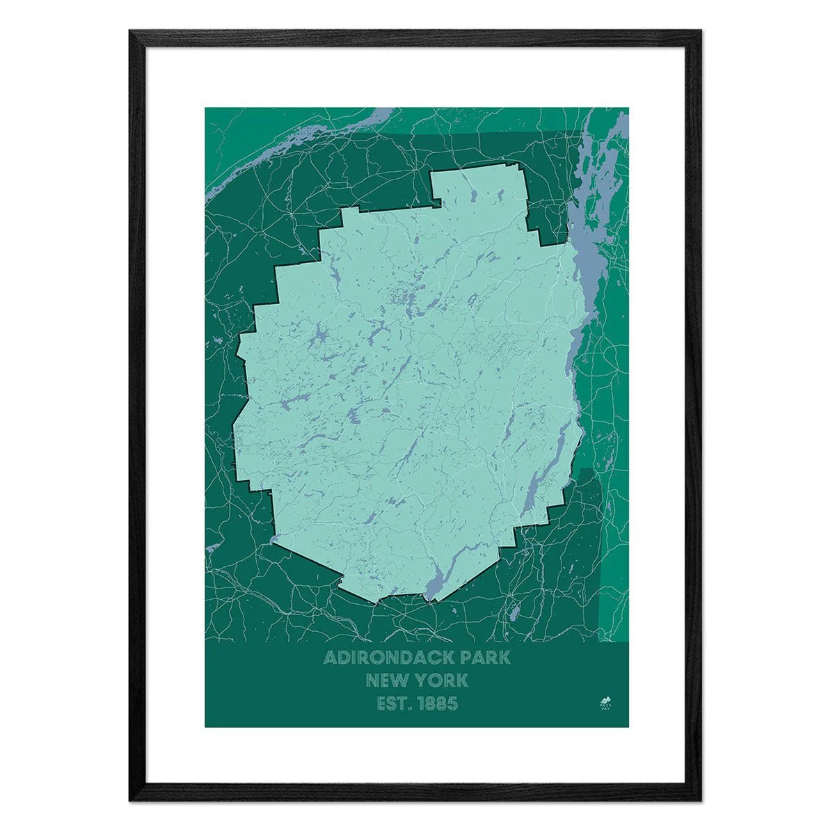 When a friendly ranger at the entrance station hands you a brochure-style map of a national park, a world of possibilities unfolds on your lap. That’s the spirit that underlies our map of Adirondack Park. To make our National Park Series of maps into works of art, we give them a clean, modern aesthetic, representing the outline of the park and including its major landforms, roads, and trails. No text—we let the landscape speak for itself.