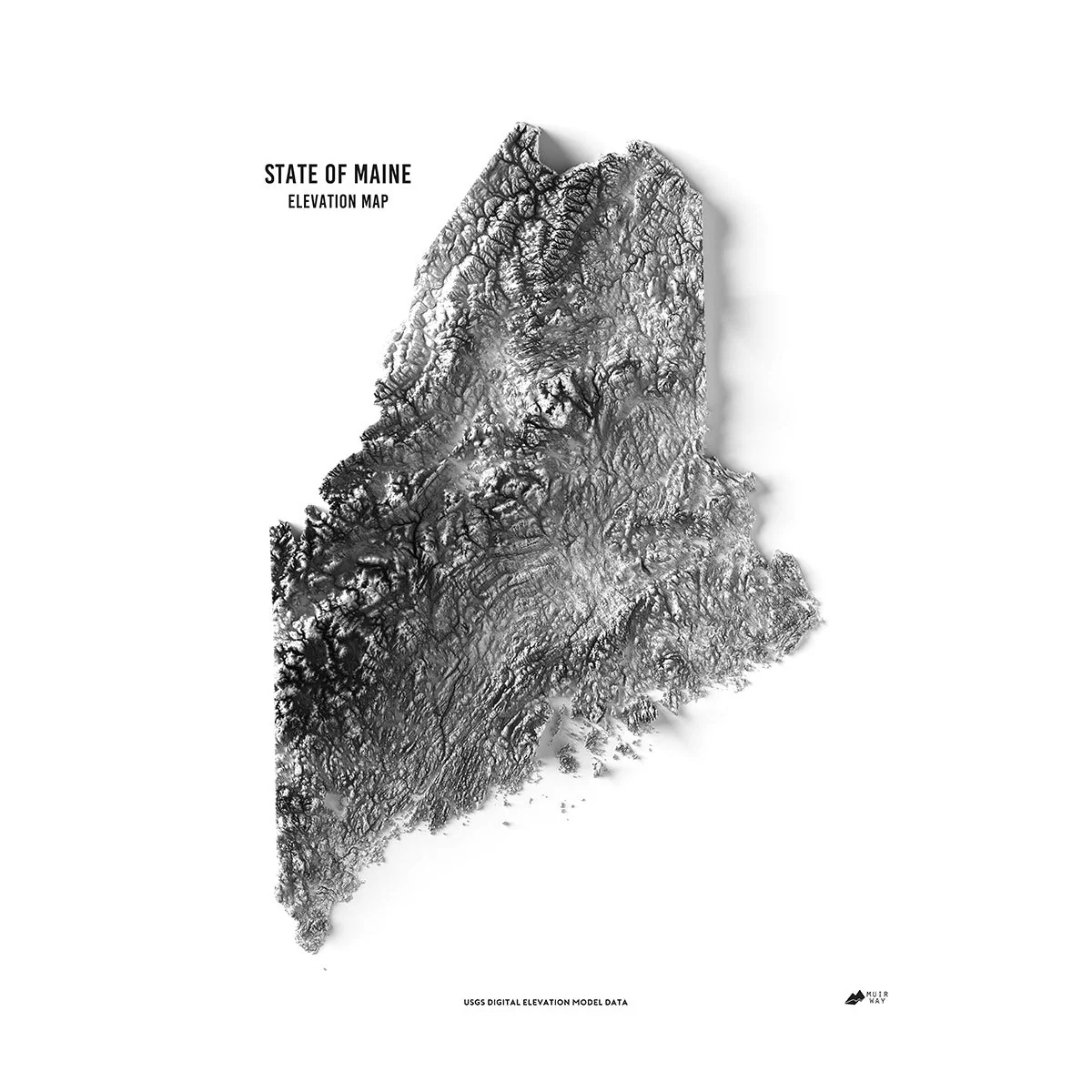 Explore the diverse and beautiful terrain of Maine and all of its distinctive character revealed within the detail of this relief map. Through the use of DEM data from the USGS, we magnified the features of its terrain by exaggerating their elevations and applying hillshade. The effect is one that will provide you with endless opportunities to investigate the compelling landscape of Maine.