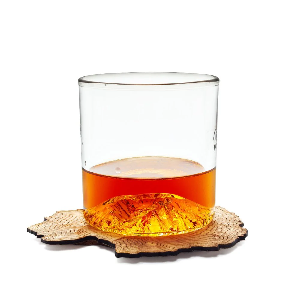 Custom wood coaster set featuring USGS topographic data of Mount St. Helens, the iconic erupted Washington volcano. Set of 2 coasters of laser-cut birch ply with a cork backer. Made in USA and packaged in custom muslin bag.